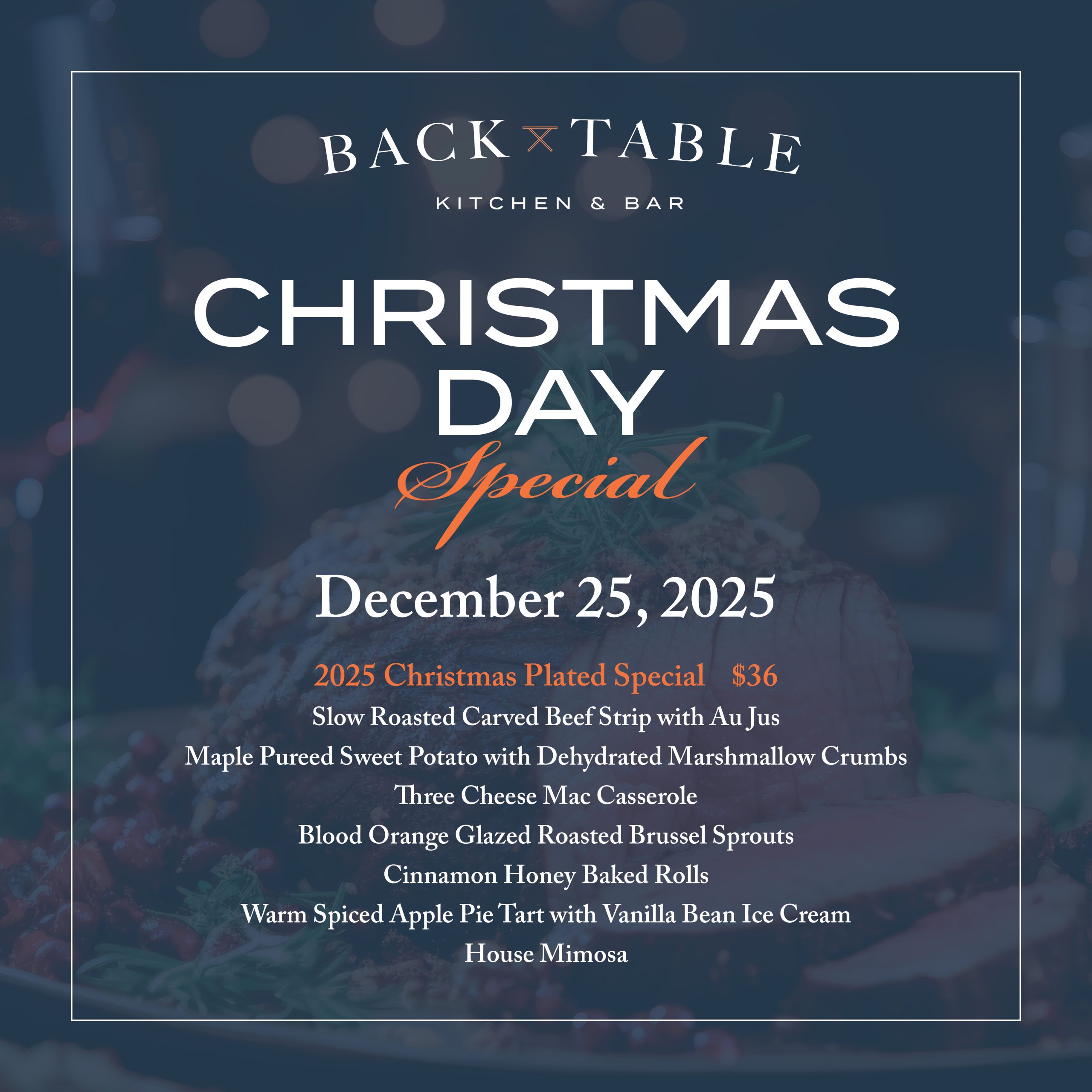 Savor the spirit of the season with a beautifully crafted Christmas Plated Special. This elegant holiday menu features Slow Roasted Carved Beef Strip with Au Jus, accompanied by Maple Purée Sweet Potato with Dehydrated Marshmallow Crumbs, Three Cheese Mac Casserole, and Blood Orange Glazed Roasted Brussels Sprouts. Freshly baked Cinnamon Honey Baked Rolls add a comforting touch, while a Warm Spiced Apple Pie Tart with Vanilla Bean Ice Cream and a House Mimosa complete this festive dining experience.