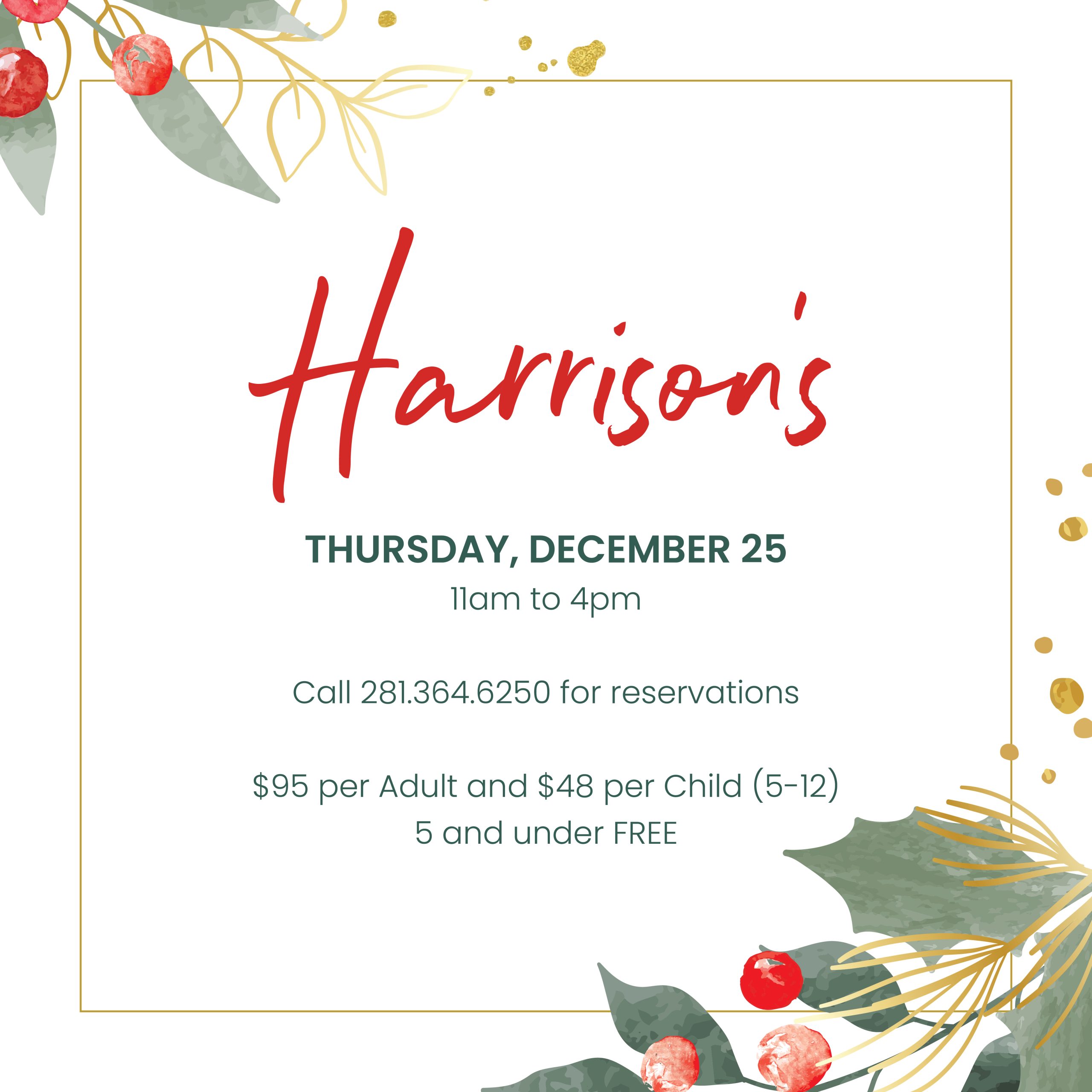Celebrate the joy of Christmas Day with an unforgettable Christmas Day Brunch Buffet at Harrison’s where holiday elegance meets culinary indulgence. Enjoy festive favorites from carved turkey and crown roasted pork to oysters, sushi, and housemade pastries, plus decadent desserts and a gourmet hot cocoa station. A joyful feast designed to capture the spirit—and sparkle—of the season. $95 adults | $48 children (5–12)