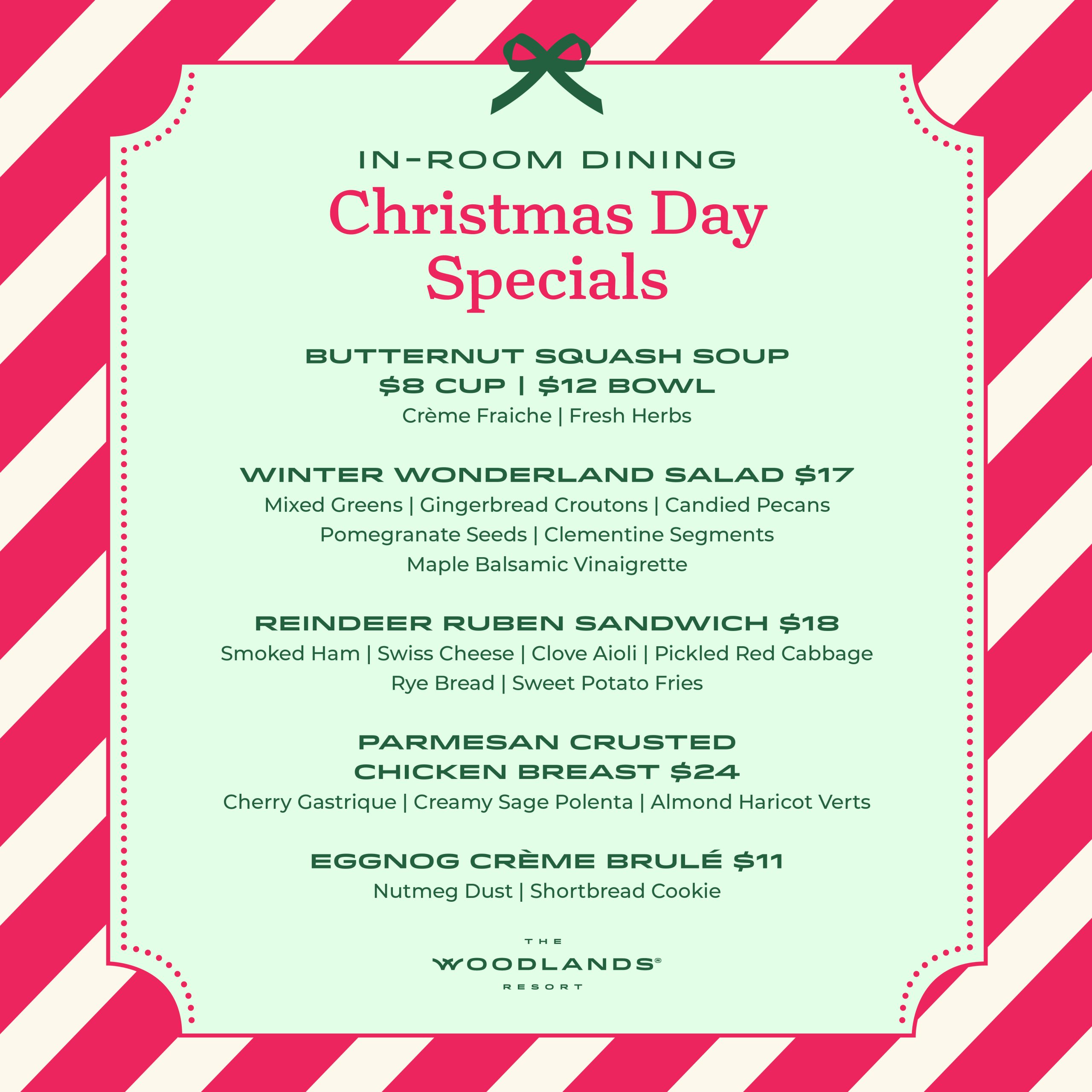 Celebrate the magic of Christmas with an in-room dining experience that brings gourmet holiday flavors and warmth to your private retreat.