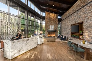 This space serves to welcome guests with a new layout and great artwork and a bar that takes in the views of nature that surround.